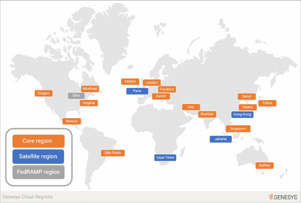Genesys Cloud uses multiple, independent AWS regions around the globe to provide a distributed cloud environment with secure access for organizations. Genesys Cloud offers two main types of AWS regions: core and satellite.
